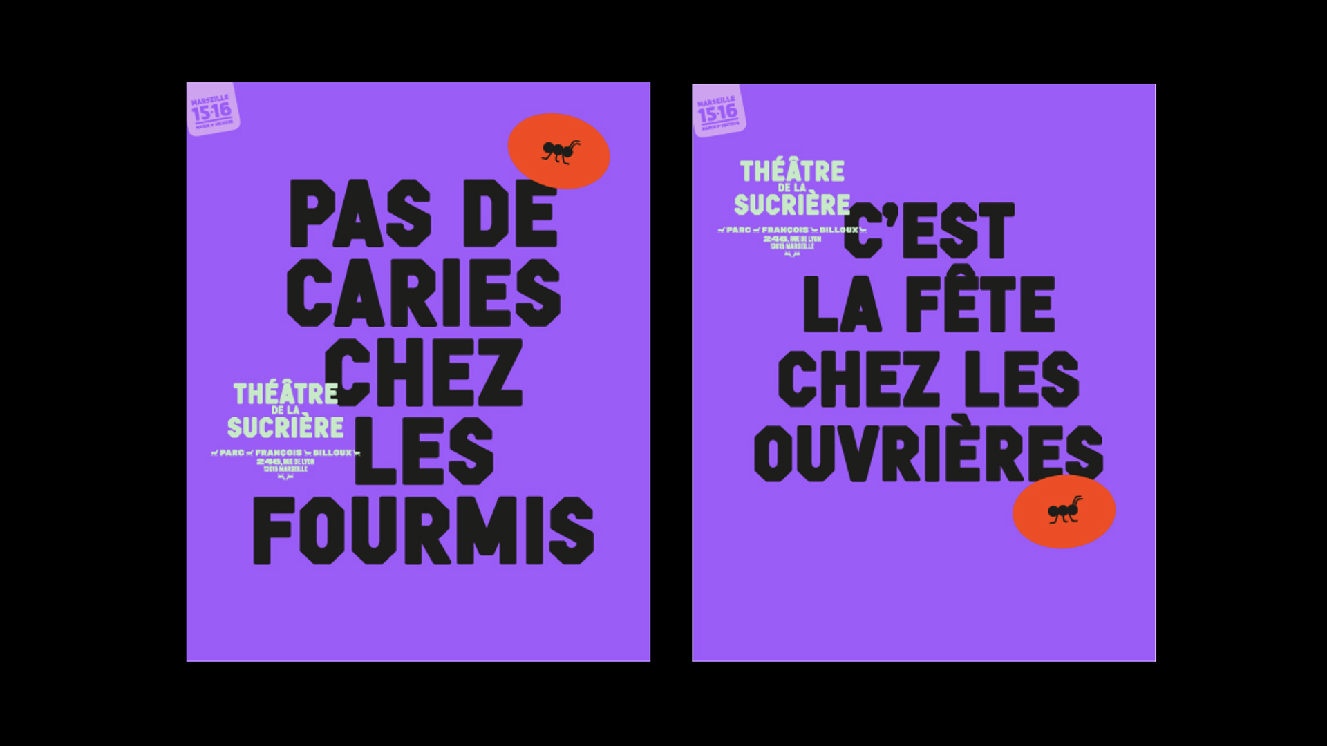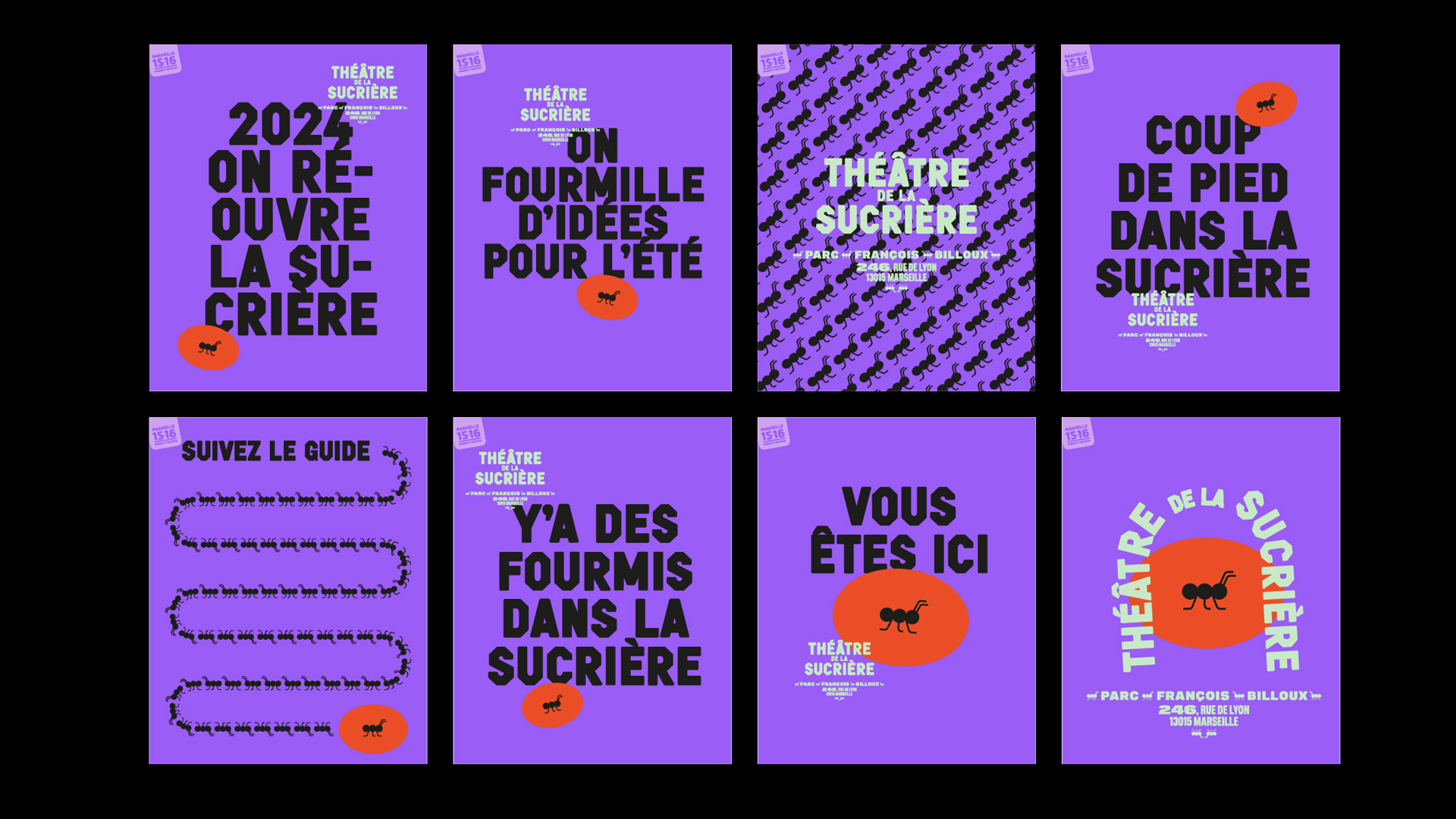 Datack a accompagné la Mairie des 15 et 16e arrondissements de Marseille dans la refonte de l’identité du Théâtre de la Sucrière (13015). Le symbole de la fourmi incarne l’esprit ouvrier et collectif du quartier, la solidarité et la capacité à rassembler — un marqueur visuel fort pour une nouvelle programmation culturelle engagée, populaire et ouverte à chacun. La livraison de la charte graphique permet d’affirmer ce lieu comme reflet du territoire.